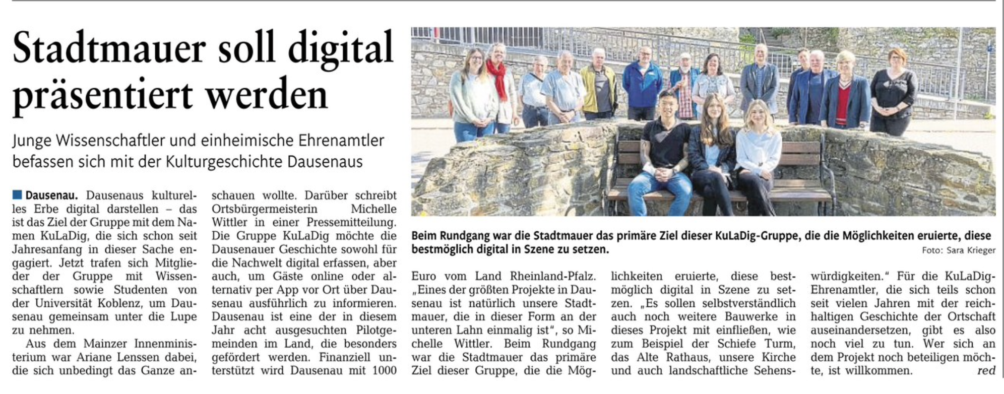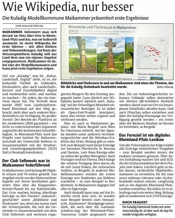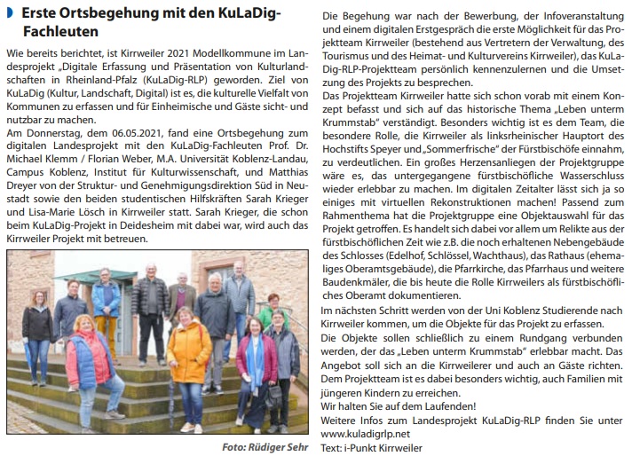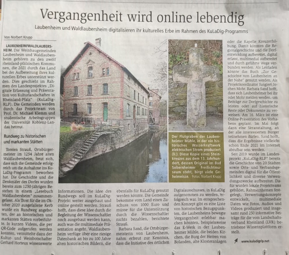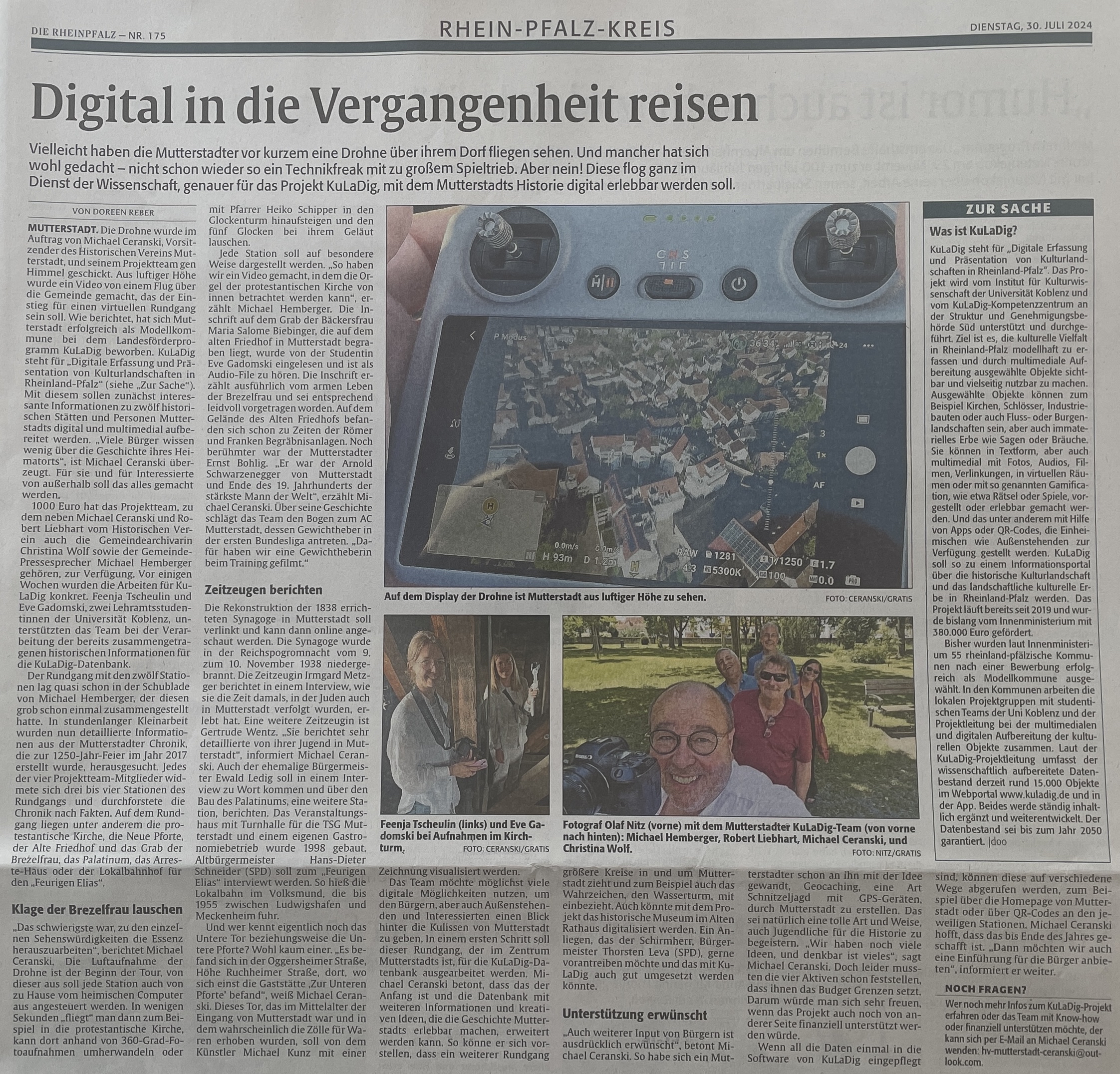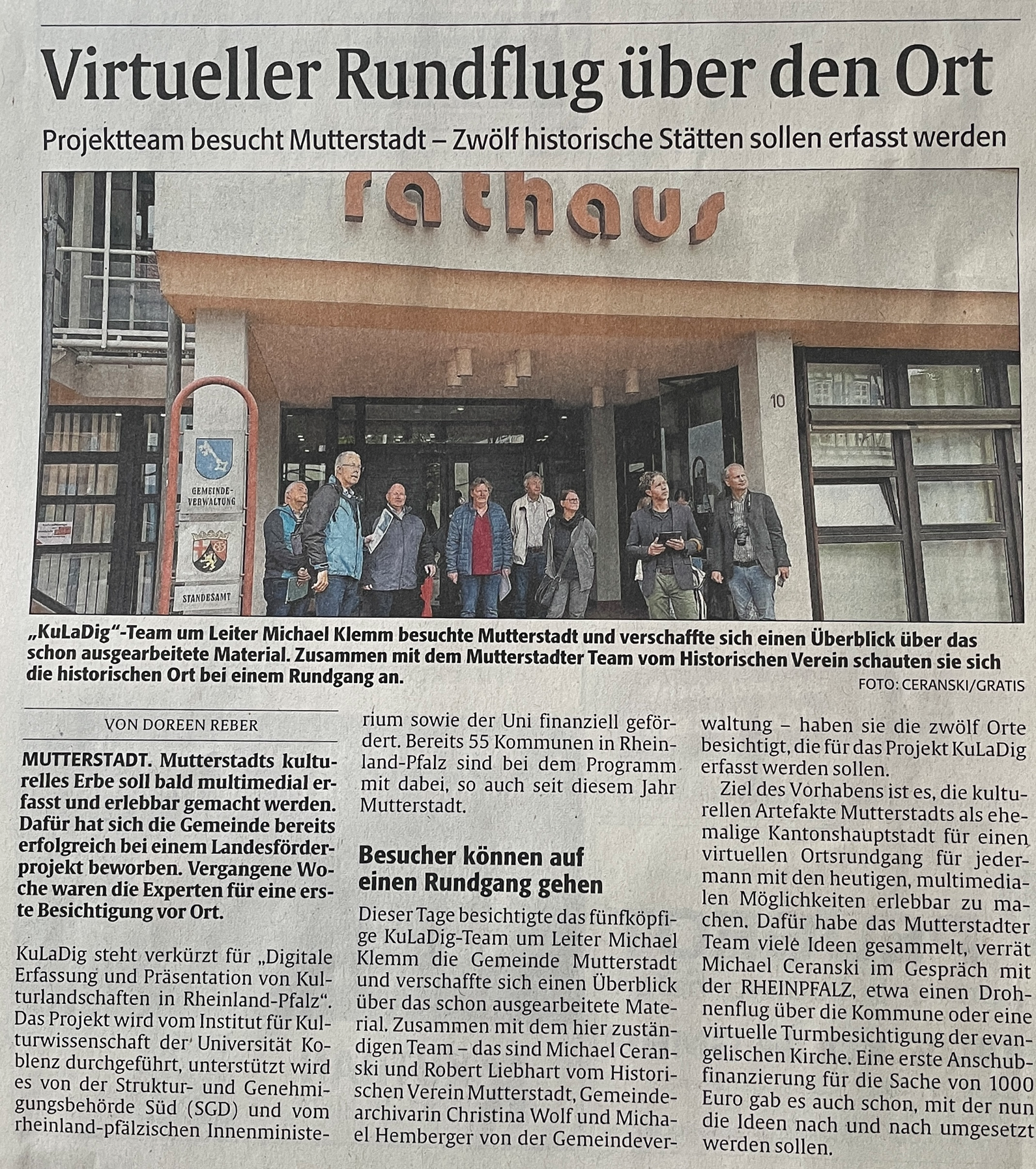 Wochenblatt-Reporter über die Begehung im Teilprojekt Mutterstadt (22.05.2024): https://www.wochenblatt-reporter.de/mutterstadt/c-lokales/kuladig-kultur-landschaft-digital-mutterstadt-ist-mit-dabei_a557128#gallery=null