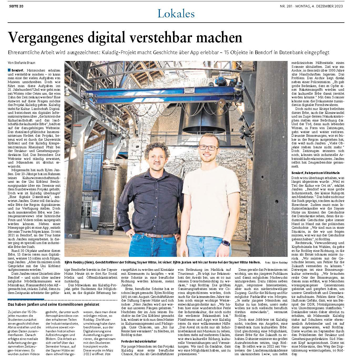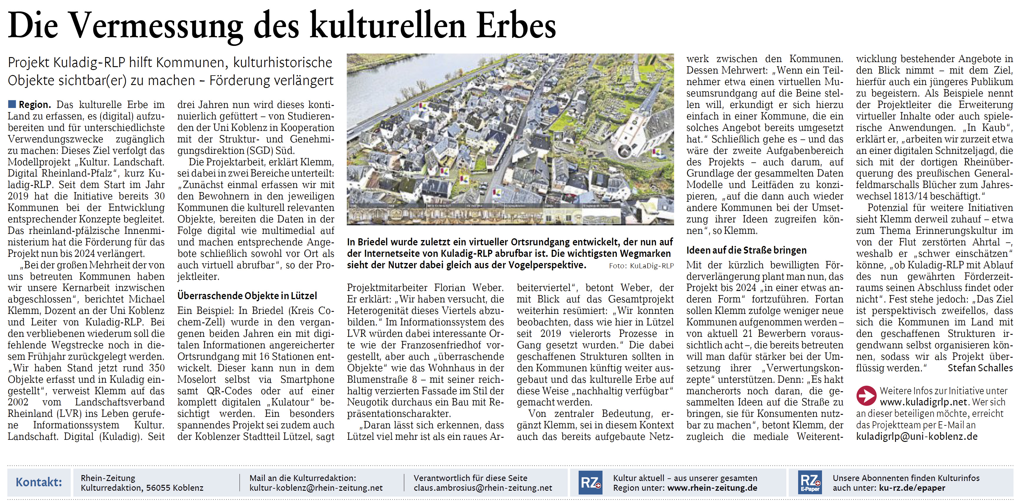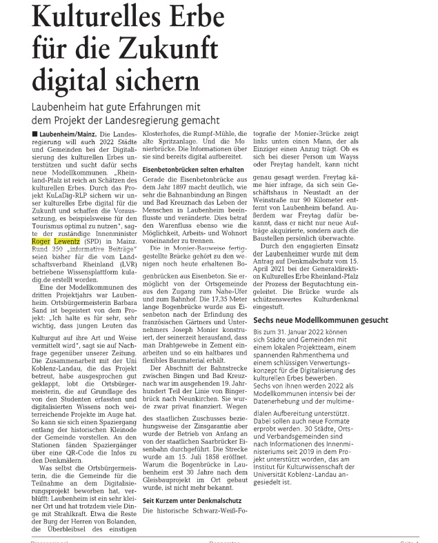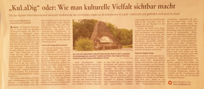 Rhein-Zeitung über die KuLaDig-Kommune Koblenz-Lay (17.12.2021)