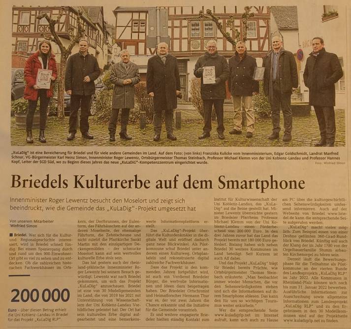 Rhein-Zeitung über die Fördermittelübergabe für 2022-2024 und das Teilprojekt Briedel (22.01.2022):