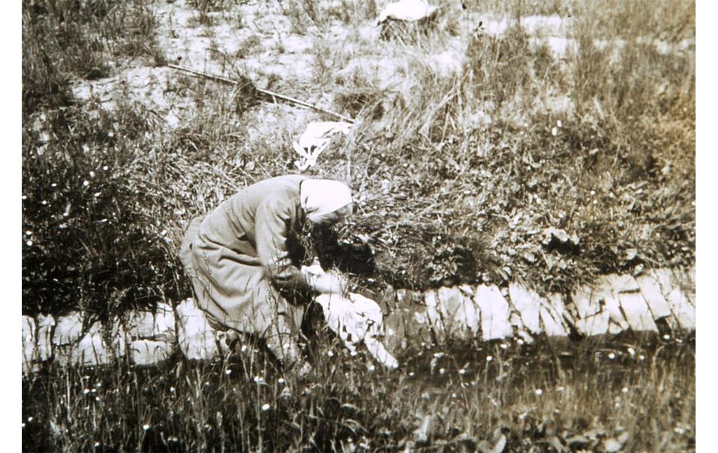 Gertrud Feiler beim Auslegen gewaschener Wäsche auf einer Wiese zum Bleichen (1940er Jahre).
